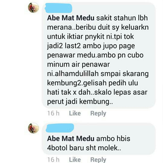 Ramai yang telah mencuba dan memberikan maklum balas yang positif dari pengalaman mereka yang telah mencuba penawar medu(gastrik) dan ini hasilnya. (Lihat pada gambar untuk testimoni)
